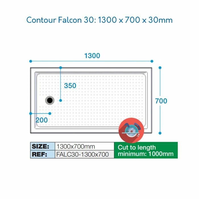 The table below indicates how a standard size tray can be cut to length to make other common size shower trays. Contour offer a FREE ‘Cut to Length’ service available on request. Longer lead-time applies. Please call 0800 280 8008 for further details.