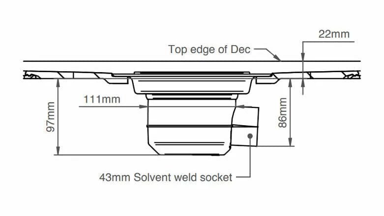 All Impey Level Dec Easy Fit floor formers are supplied as standard with the UTVG01/H (grey cover) vinyl floor gully with a horizontal outlet – a high quality water trap featuring a 50mm water seal, flexible 43mm outlet.