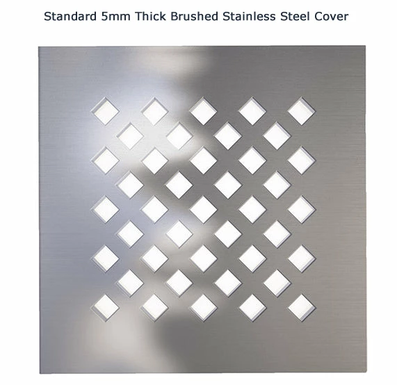 The Aqua Flat walk in shower tray comes complete with a horizontal drain (flow rate > 0.9 l/s), a vertical option is available upon request. Optional brushed solid stainless steel (5mm thick) drain covers are available. A tileable drain cover is also available to replace the grate, edged with stainless steel upstand, suitable for tiles with a thickness from 8mm.