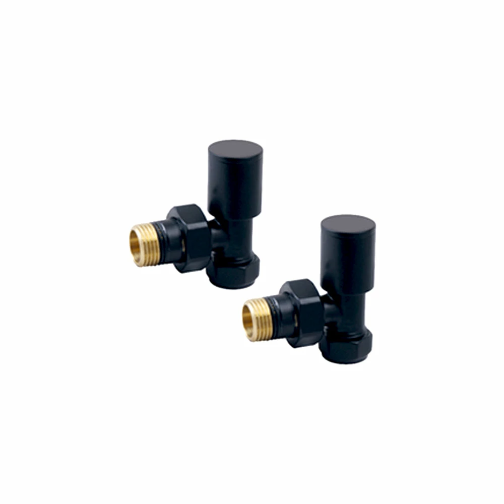 This pack of Redroom angled radiator valves in black have manual rather than thermostatic controls, meaning you can turn them on and off as needed. Angled valves like these are necessary when your central heating pipework has to come out of the wall. The perfect match for our anthracite Redroom radiators available now. 2-year guarantee. Also available in chrome and anthracite.
