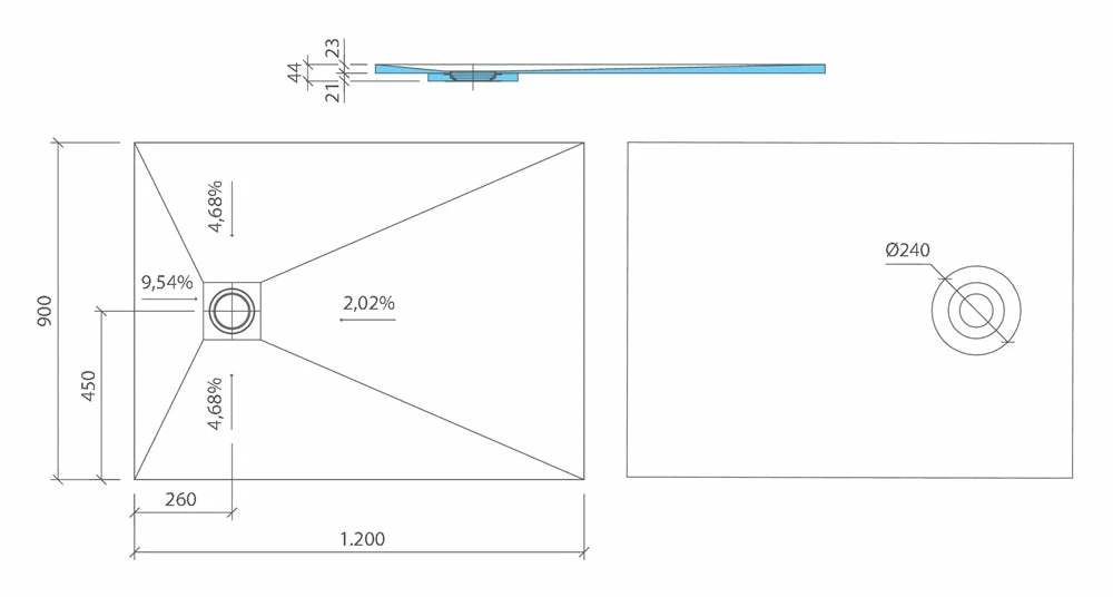- 1200 x 900 x 23mm (44mm at drain collar)
