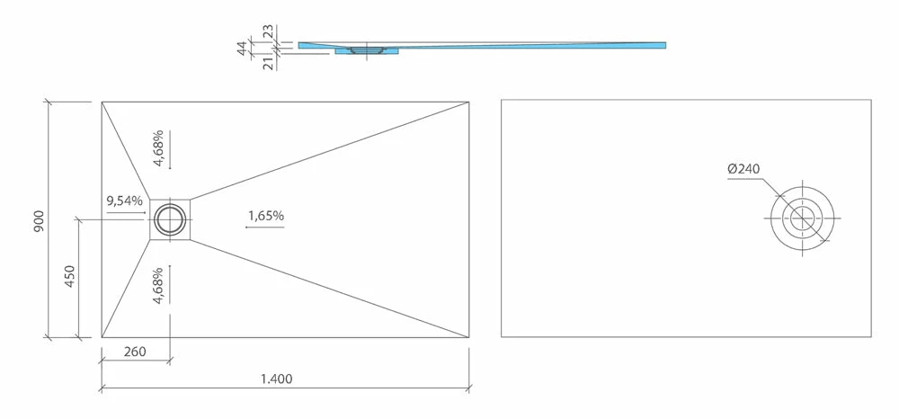 - 1400 x 900 x 23mm (44mm at drain collar)