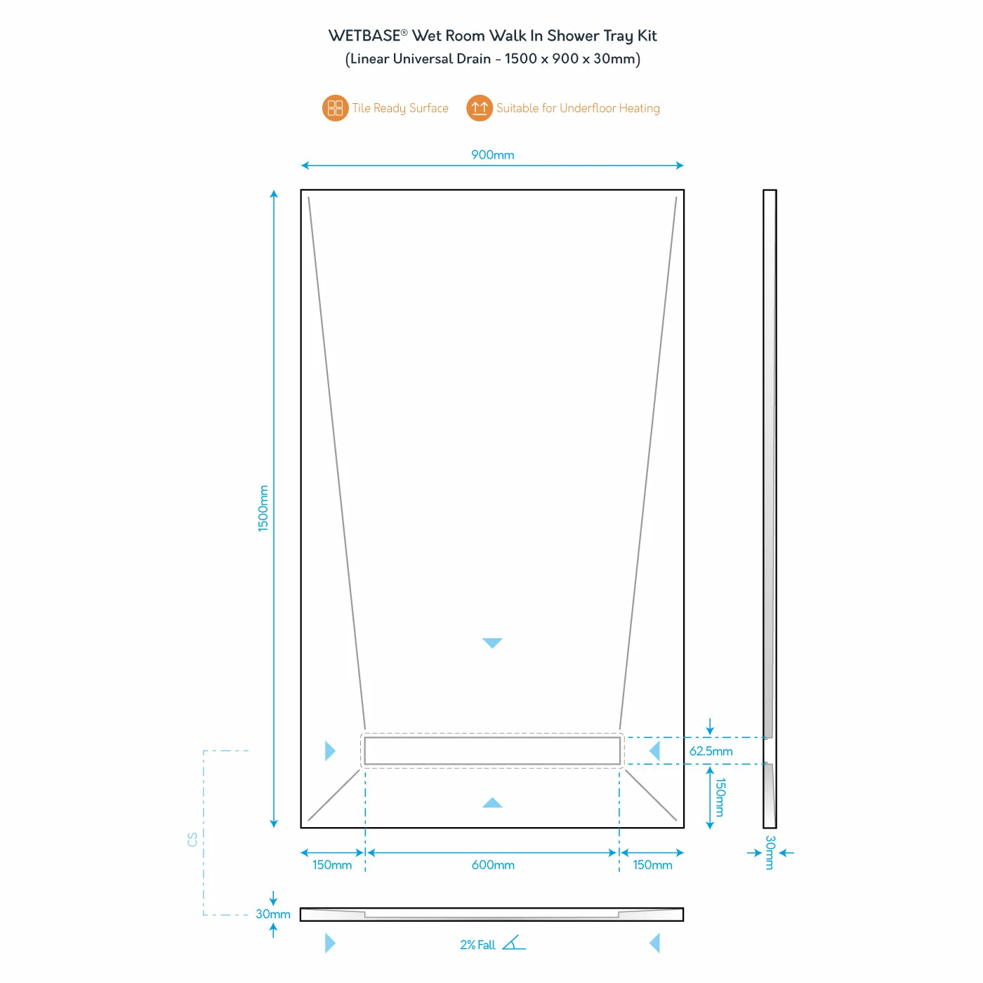 - 1 x 1500 x 900 WetBase® Linear Universal tray 30mm deep, 2% fall.