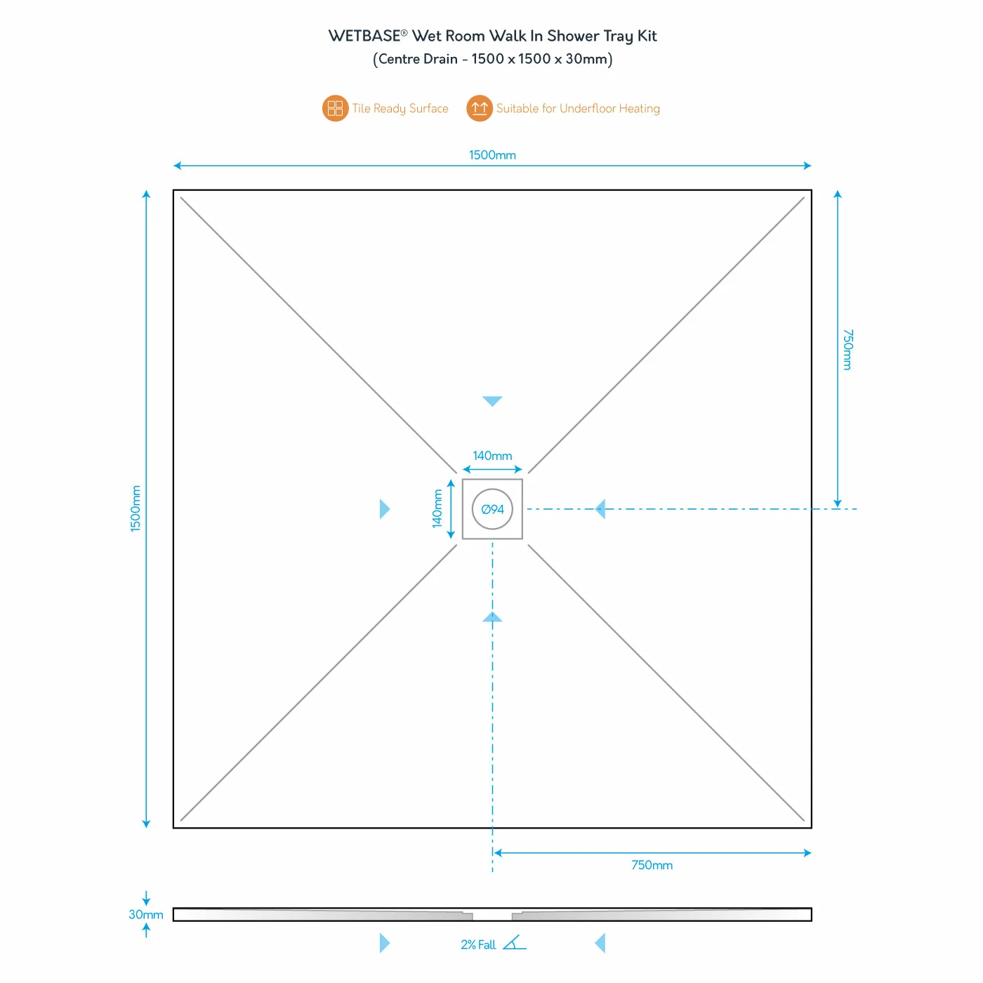 - 1 x 1500 x 1500 WetBase® tray 30mm deep, 2% fall.