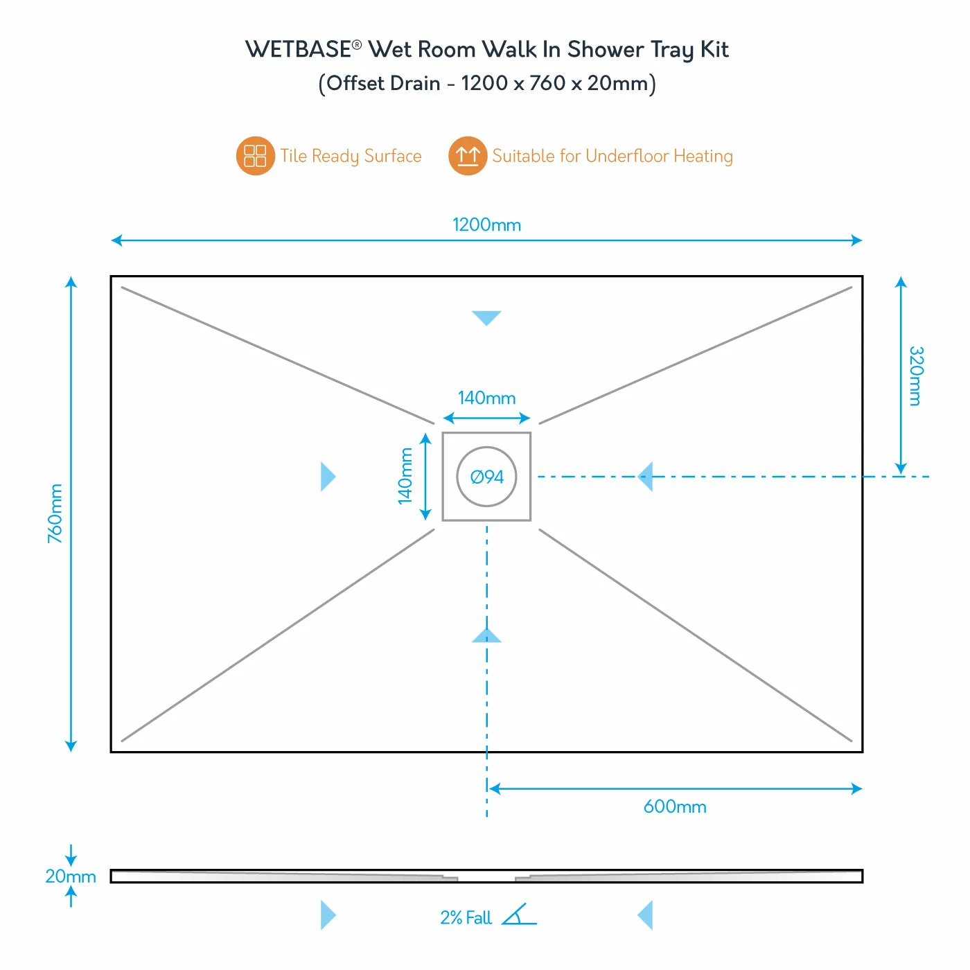 - 1 x 1200 x 760 WetBase® tray 20mm deep, 2% fall.