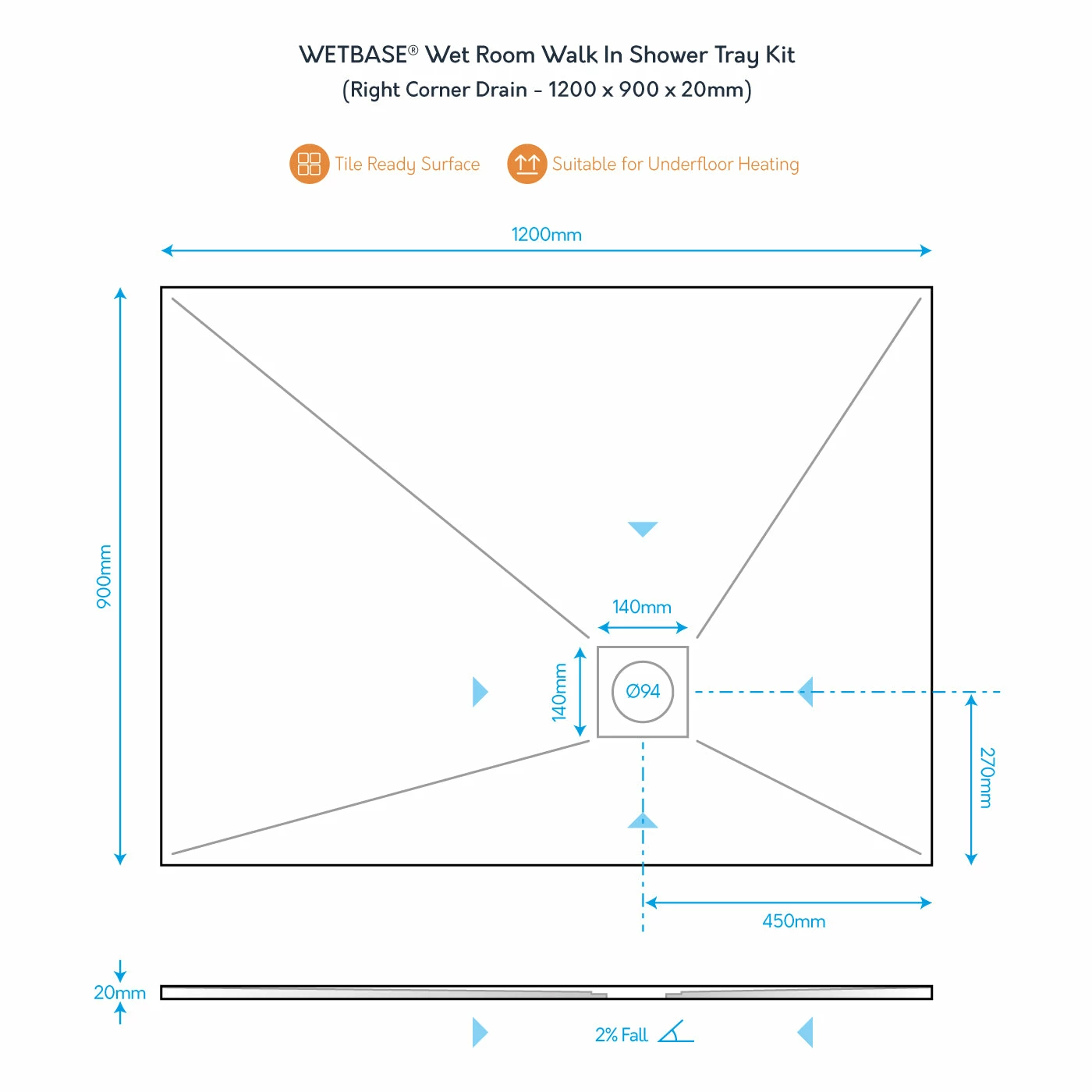 - 1 x 1200 x 900 WetBase® tray 20mm deep, 2% fall.