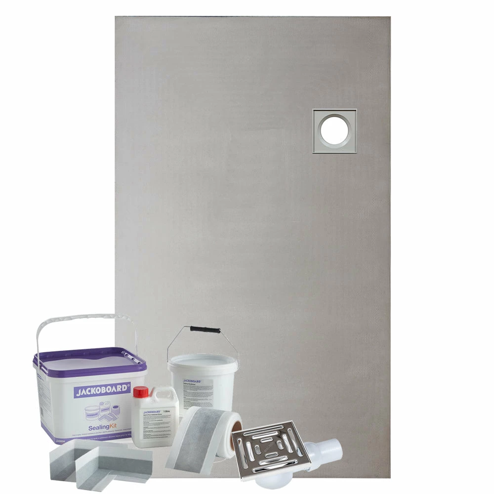 Optional Jackoboard 5kg liquid based (no mixing required) tanking kit for waterproofing the shower area walls and floor, or a complete Tanking, Fixing & Sealing Kit for fixing the WetBase®, waterproofing the floor and walls in addition to sealing the perimeter of the tray where it meets the wall / surrounding floor. The perfect solution for installing a wet room or walk in shower. Available at a discounted price when purchased with a wet room tray.